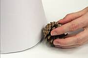 Półkole z brystolu zwiń w rożek, zszyj zszywaczami i podklej mocną taśmą. Usztywnij podstawę stożka, odrysowując na brystolu koło i wklejając je od spodu za pomocą pistoletu klejowego. Uważaj, żeby się nie poparzyć gorącym klejem. Z każdej szyszki odłam ogonek, dzięki temu szyszka dokładniej przyklei się do kartki.