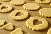 Podsypując nieco mąką, wałkować cienki na kilka milimetrów placek i wycinać serduszka. W połowie serduszek wyciąć mniejszą foremką otwór w kształcie serduszka.