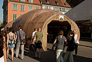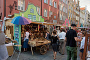 Na trwający kilkanaście dni Jarmark św. Dominika zjeżdża około tysiąca handlowców, aby setkom tysięcy gości oferować swoje wyroby lub utrwalać w polskim społeczeństwie świadomość marki. W ubiegłym roku Wedel wystawił niewielką przenośną czekoladziarnię, w tym roku spośród maleńkich kramików można było wyłuskać krakowski Kredens z nietanimi, ale i niebanalnymi pod względem smaku wyrobami.Jak co roku, prezentowane są kuchenne "przydasie", niektóre w prawdziwie przekonujący sposób. Jedna z uznanych gdańskich piekarni sprzedaje swoje wyroby w niezwykłym stoisku o kształcie bochna chleba. Ta chlebowa użytkowa rzeźba znalazła już stałe miejsce w sercach mieszkańców, od kilku lat usadawiając się w pobliżu najstarszych zabytków Gdańska i kusząc kupujących długimi stołami i regałami zasypanymi różnorakim pieczywem. Wieczorne zdjęcie niestety nie oddaje pełnej pachnącego przepychu przedpołudniowej rzeczywistości, musicie więc uwierzyć na słowo wieloletniej bywalczyni Jarmarku.