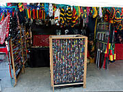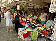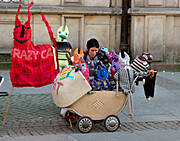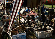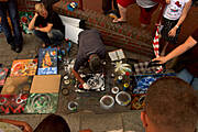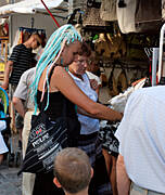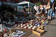 Na szczęście nie cały jarmark składa się z takich atrakcji. Odwiedzających tę tłumną imrezę czeka niezwykła kondensacja rękodzieła i staroci. Szydełkowe kolczyki, broszki ze sfilcowanej wełny, urokliwe materiałowe koty z koślawo przyszytymi oczami z guzików i łapami każda w innym rozmiarze, wełniane czapy powstające na oczach przechodniów, monety, znaczki, popękana wiekowa ceramika, zardzewiałe maszyny do szycia, hełmy, mosiężne żyrandole, wyblakłe abażury, resoraki z lat siedemdziesiątych, kolekcje płyt do adapterów z przebojami już nie z tej ziemi. Klasyczne przykłady zabytkowego kiczu zamkniętego w płóciennych zjedzonych przez korniki ramach i uliczni artyści tworzący jeszcze mniej trwałe kosmiczne krajobrazy za pomocą kawałków kartonu, szmatek i farby w sprayu.