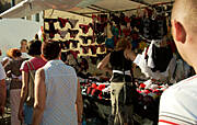 Jeszcze dziesięć lat temu na jarmark dominikański jechało się między innymi "na ciuchy", z nadzieją nabycia tego co modne i nie za drogie. Dzisiaj stoiska z odzieżą epatują masowością, bezfirmowością, nadrabiając braki jaskrawością towarów i promocji. "Wszyśkie paski po pinć złotyyy" z kilku stron słychać chrapliwie konkurencyjne nawoływania sprzedawczyń. "Zapraszamy do promocji kosmetyków - wszystkie artykuły po pięć złotych" z innego kąta z przekonaniem krzyczy dobrze wyszkolona w kramarskim public relations młoda dystrybutorka pachnideł z dużym dekoltem. Boję się sprawdzać cenę czarownej koronkowej bielizny wywieszonej nieopodal zażenowanych kościelnych murów. Kilka stoisk dalej milcząco i wstydliwie, choć z uśmiechem, masażowi tajemniczym przyrządem przypominającym suszarkę, poddaje się ponętna młoda szyja. W oddali zanika dobywające się z przenośnych odtwarzaczy CD wycie polskiego disco polo.