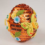 Styropianową formę spryskaj farbą i pozostaw do wyschnięcia. Początek cekinowej taśmy przymocuj za pomocą szpilki na czubku jajka. Owijaj jajko cekinową taśmą, co jakiś czas przytwierdzając ją szpilkami (na początku i końcu taśmy, tam gdzie cekinowe sploty będą gęste - czyli na obu końcach jajka - umieść szpilki w każdym cekinie).