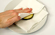 Bakłażana myjemy, kroimy w plastry i obsypujemy z obu stron warstwą soli. Zostawiamy bez przykrycia na około 30 minut. Pod wpływem soli warzywo puści sok. Po mniej więcej 10 minutach pojawią się pierwsze wyraźne krople wilgoci, po kolejnym kwadransie plastry bakłażana będą zanurzone w małych kałużach soku. Odciskamy go bardzo dokładnie za pomoca papierowego ręcznika. Bakłażan jest gotowy do przyrządzenia. Oczywiście już go nie solimy.