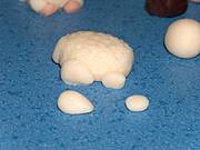 Z 2 kulek na łapki uformuj łezki, przyklej po bokach, przednie łapki - lekko jajowate kuleczki - z przodu.