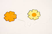 Czas na łączenie elementów. Nawleczcie igłę, na końcu nitki zróbcie supełek. Przeciągnijcie nitkę przez kwiatek w dwóch miejscach, blisko środka. Miejsca przebicia zamaskujcie, naklejając z obu stron kółeczko w wybranym kolorze. Umieśćcie kilka kwiatków na jednej nitce tak, aby znalazły się w pewnej odległości od siebie.
