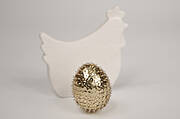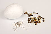 Wykonanie złotego jajka jest tak proste, że tak naprawdę nie jest potrzebny żaden opis. Na szpilkę nawlekamy koralik, następnie cekin i wbijamy w styropianowe jajko. Po umieszczeniu obok siebie, lub na lekką zakładkę, cekinów, złote jajo jest gotowe. Można postawić go obok kury.