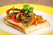 8 kromek pieczywa pszenno-żytniego (chleba domowego, staropolskiego lub innego ulubionego), 2 strąki papryki (np. czerwonej i żółtej lub zielonej), 1 dużą cebulę, 8-10 większych pieczarek, 1 łyżkę oliwy, 1 łyżeczkę masła, sól i świeżo mielony biały pieprz (do smaku), dużą szczyptę ziół prowansalskich, 1 płaską łyżeczkę brązowego lub trzcinowego cukru, 1-2 łyżeczki białego octu winnego, 8 łyżek drobno tartego sera Grana Padano, 1 słoiczek ostrej grubo mielonej Lutenicy (ok. 300g)