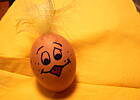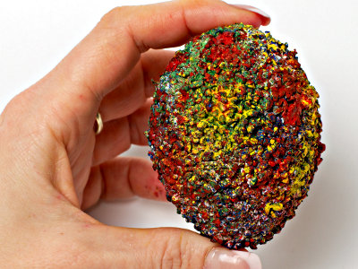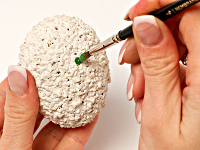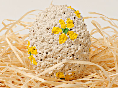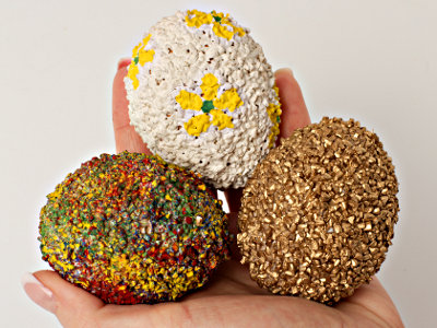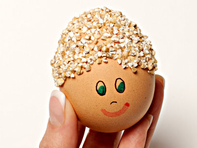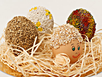 2. Jajka obklejone kaszą możecie po wyschnięciu dowolnie ozdobić. Jeśli wykonujecie pisanki razem z dziećmi, na pewno ucieszy je namalowanie flamastrami jajecznej buzi. Kto nie czuje się na siłach próbować swych sił na polu malarskim, może posprayować jajko farbą w wybranym kolorze. Lubiący wyzwania i eksperymenty na pewno chętnie spróbują wykorzystać technikę pstrykania dość gęstą farbą plakatową nabieraną na włosie starej szczoteczki do zębów. Warto też pomalować jajko jednym kolorem, a gdy farba wyschnie, małym pędzelkiem nanieść na powierzchnię barwny wzorek.