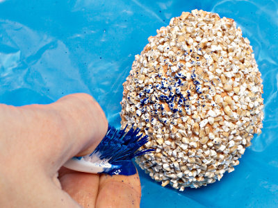 Pędzlem nanosimy na jedną połowę jajka dość grubą warstwę wikolu. Dokładnie zanurzamy jajko w kaszy jaglanej, miejsca niedokładnie obklejone kaszą uzupełniamy, delikatnie wciskając drobinki palcami. Pisankę odkładamy na minimum 15 minut do wyschnięcia. W tym czasie klej dobrze zwiąże i będziemy mogli przystąpić do dalszej części ozdabiania. Z oczywistych względów praktycznych nie polecam smarowania od razu całej powierzchni jajka wikolem.