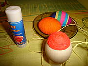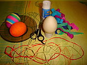 Jajko posmarować klejem i zaczynając od góry przyklejać bibułębciasno "raz koło razu", robiąć wkoło jajka ślimaka.