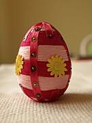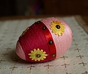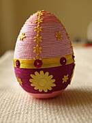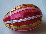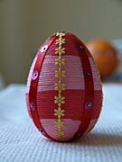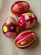 Nie nakładać kleju zbyt szerokimi pasami, bo bardziej wtedy zaklejają się palce, a od nich mulina. Po oklejeniu jednej połówki jajka, łącznie z jego czubkiem, podobnie postępujemy z drugą połówką, zaczynając od miejsca, w którym zaczyna się nić pierwszej połówki. Jajka można okleić jednym kolorem, lub kilkoma, według upodobań. Gdy już całe jajko będzie oklejone przystępujemy go do ozdabiania wstążeczkami, kwiatkami, cekinami i tym co chcemy, przyklejając i przypinając szpilkami.