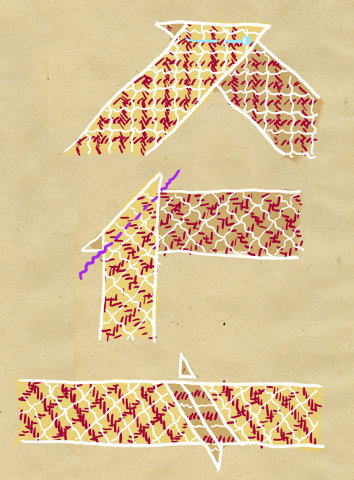 Krótkie brzegi skrojonych plisek o prostym kierunku nitek złóż prawymi stronami do środka, aby ostre narożniki wystawały z każdej strony.