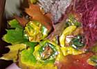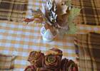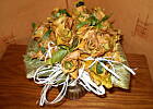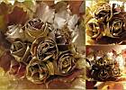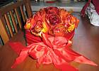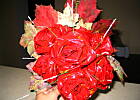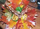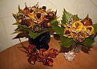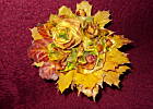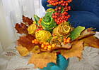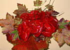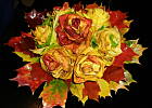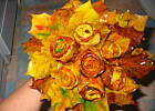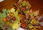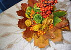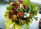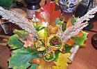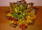Warto pomyśleć o przybraniu - czasami wystarczy okolić różyczki różnokolorowymi dużymi liśćmi klonu. Można też wpleść dodatki w postaci klonowych nosków, owoców głogu, podłużnej drobnej dzikiej róży, liści i owoców jarzębiny.