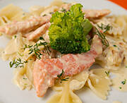 Farfalle z łososiem150 g makaronu kokardki,150 g surowego łososia norweskiego, 1 duża cebula, 50 g różyczek brokuła, ok. 150 ml niesłodzonego mleka skondensowanego, ok. 150 ml słodkiej śmietanki 12% do sosów, 2 żółtka, 1/3 łyżeczki mielonej gałki muszkatołowej, sól, świeżo zmielony pieprz, 2 łyżki oliwy,1 łyżeczka soku z cytryny