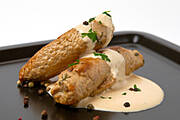 Tagliatelle z drobiowymi roladkami1 średni filet z indyka, 30 dag pieczarek, 1 duża biała cebula, 2 łyżki posiekanej natki pietruszki, 1/4 łyżeczki suszonego tymianku, sól, kolorowy pieprz, 4 łyżki oliwy, 2 szkl wywaru warzywnego, 250 ml słodkiej śmietanki 18%, 2 płaskie łyżeczki mąki pszennej