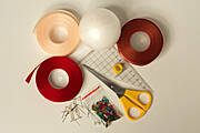 Przygotuj kulę ze styropianu o średnicy 6-8cm, dość sztywną lekko połyskującą taśmę lamówkę o szerokości 2,5cm (w jednym, dwóch lub więcej odcieniach), węższą ozdobną tasiemkę na zawieszkę długości ok. 30 cm, kilkadziesiąt cienkich szpilek, cekiny w wybranym kształcie i kolorze do maskowania szpilek oraz kilka szpilek ozdobnych. Przydadzą się też linijka do odmierzania długości pasków lamówki oraz nożyczki (najlepiej krawieckie, aby nie strzępiły brzegów tasiemki).