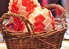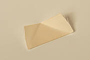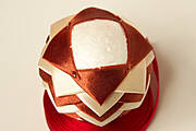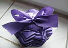 W miejscu, gdzie krzyżują się tasiemki, dokładnie na środku wbijamy ozdobną szpilkę. Tniemy lamówkę na fragmenty o długości dokładnie 5 cm, ewentualnie o kilka milimetrów dłuższe (długość nie może być krótsza niż szerokość lamówki przemnożona razy dwa). Zaginamy narożniki, aby powstał równoramienny trójkąt o ładnym ostrym wierzchołku.