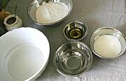 Ja przygotowuję sobie wszystkie składniki przed robieniem ciasta, odmierzam porcje i stawiam w zasięgu reki. Do tego biorę glinianą misę, w której rozpoczynam wyrabianie i drewnianą kopystkę do pomocy przy mieszaniu - zawsze to mniej bałaganu i polepionych rąk. Zanim też zacznę, mleko łączę z wodą i szczyptą cukru i podgrzewam w mikrofalówce (można w garnuszku) do tzw. "letniej" temperatury. Można uznać, że jest to nieco niższa temperatura jak temperatura ciała. Nastawiam też piekarnik na 50 st. C z termoobiegiem (tam będzie rosło ciasto).