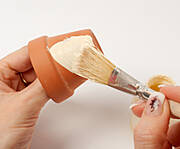 Do nanoszenia koloru używaj pędzla lub kuchennej gąbeczki. Pędzlem nanoś farbę w zwykły sposób, natomiast gąbeczką maluj, przyciskając ją raz po raz do powierzchni doniczki. Aby farba nie prześwitywała, potrzebne będą dwie lub trzy warstwy.