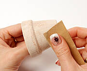 Jeśli farba była nanoszona pędzlem, możesz drobnym papierem ściernym zrobić przetarcia imitujące efekt spękań. Można też w wykonanie ozdobnej doniczki włożyć więcej wysiłku i uzyskać efekt postarzenia za pomocą cracka do decoupagu.