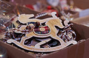 Choć w tym roku obiecałam sobie, że nie nabędę żadnych gotowych ozdób, ulegam czarowi drewnianych koników. Wybieram niewielkiego na biegunach, jednocześnie wzdychając do konikowych zawieszek ze sznurem ozdobnych koralików, które też mocno kuszą.