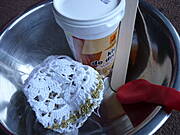 Potrzebne nam będą: szydełkowa bombka, klej wikolowy, okrągły balonik, miska metalowa lub plastikowa, woda, patyczek do mieszania.