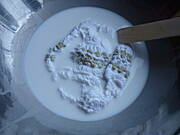 Klej mieszamy z wodą w proporcji 1:1. Dokładnie mieszamy, żeby nie było grudek kleju.Bombkę zanurzamy w roztworze kleju z wodą, chwilę moczymy, żeby nasiąknęła. Wyjmujemy i wyciskamy nadmiar kleju.