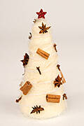 Zabieramy się do pracy! Na styropianowy stożek nakładamy cienkie warstwy płynnego kleju, zaczynając od podstawy, po okręgach. Ostrożnie przyklejamy przygotowane wcześniej pasma białego sizalu. Lekko dociskamy. Gdy okręcimy już całą choinkę sizalem, odcinamy nadmiar niteczek. Miejsce odcięcia maskujemy, przyklejając, również za pomocą glue guna wybraną ozdobę na czubku. Może się przydać fragment białej wełny z połyskiem, którym owiniemy choinkę, aby udawał delikatny łańcuch. Szybko przyklejamy pozostałe ozdoby (ja lubię to co naturalne - gwiazdki anyżu, krótkie laski cynamonu, goździki)... i gotowe. Choineczka może trafić na półkę lub do koszyka prezentowego. Można ją też ozdobnie zawinąć w przezroczystą folię związaną kokardą.