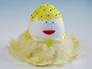 Panią Jajczyńską wymyśliliśmy nie wiadomo jak i kiedy. Po prostu powstała. W przysłowiową minutę. Do jej wykonania wykorzystaliśmy styropianowe jajo, mały fragment piór umocowanych na tasiemce (można takie pierzaste pasy, już gotowe i zszyte kupić w pasmanteriach), cienkie filcowe kwiatki (lub z agrowłókniny, lub z innego sztucznego tworzywa), szpilki, drobne koraliki, kawałek czerwonego filcu na buzię i plastikowe oczka.
