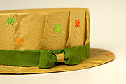 Miejsce łączenia krepiny maskujemy kilkukrotnie złożonym pasem z krepiny w innym kolorze przyklejonym do boku kapelusza. Miejsce łączenia ozdobnego pasa maskujemy, przyklejejąc prostą kokardkę.