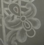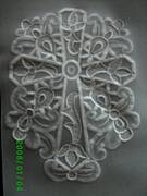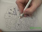 Odwracamy kartke.Ta strona,na ktorej rysowalismy bedzie odtad nasza prawa strona a druga bedzie lewa. Na lewej stronie obrysowujemy jeszcze raz bardzo dokladnie wzor poslugujac sie bardzo cienkim sztyftem kulkowym lub wypisanym dlugopisem.Nalezy naciskac lekko tak, zeby wzor stal sie wyczuwalny po drugiej stronie,ale nie za mocno bo latwo jest zrobic dziure w pergaminie