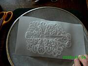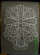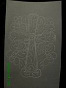Odcinamy odpowiednio duzy kawalek pergaminu. Musi byc troche wiekszy od wybranego wzoru i kledziemy go na szablonie celem odrysowania wzoru. Dobrze jest kartki przymocowac tasma klejaca do podkladki zeby zapobiec ich przesuwaniu.Biala kredka odrysowujemy na pergaminie wzor (mozna stworzyc wlasna kompozycje lub skozystac z gotowach szablonow).