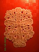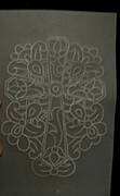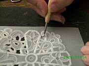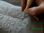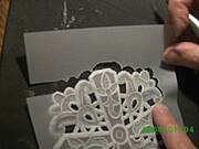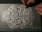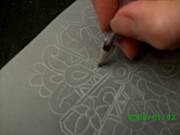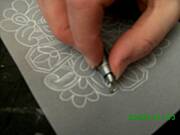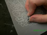 wytlaczanie ma na celu dodatkowe uwypuklenie wzoru i lepsze wybielenie pergaminu,przez co motyw staje sie bardziej wyrazny.Dlutkiem kulkowym wytlaczamy brzeg wzoru,rozkladajac nacisk tak,zeby najsilniejszy byl przy brzegu.Robimy to zawsze ruchem od zewnetrznej lini wzoru wglab.Nalezy dopasowac wielkosc dluta do wielkosci wytlaczanego wzoru.ja najczesciej uzywam dlutka o grubosci 3mm. Grube dlutko jest do duzych elementow a cienkie do malych detali.Nalezy wytlaczac bardzo delikatnie,czasem wiele razy w jednym miejscu.Gdy bedziemy naciskac zbyt mocno na pergaminie powstana nieestetyczne faldki.