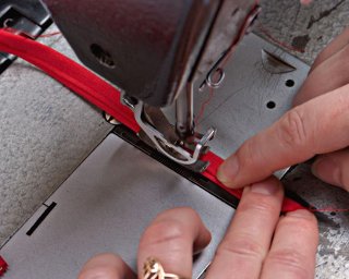 Dociskaj materiał, aby się nie przesuwał. Pamiętaj o każdorazowym mocowaniu nici na początku i na końcu szycia. Dzięki temu unikniesz prucia się stębnówki podczas użytkowania łapki.