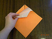8. Trzymając za prawy górny bok zaginamy go do środka tak, by jego brzeg pokrył się ze środkową linią zgięcia: