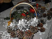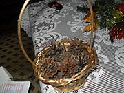 Rozgrzanym pistoletem z płynnym klejem smarujemy szyszki i wklejamy do koszyczka, tworząc dowolny kształt ( kula, stożek itd).
