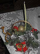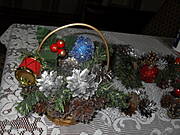 różnego typu artykuły do dekoracji świeczki, bombki, sztuczna, zielona girlanda ( pocięta na krótkie gałązki),
