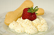 Truskawki na śnieżnych szczytach Mascarpone120g serka mascarpone, 220g jogurtu naturalnego, 3 łyżeczki cukru pudru, 1 łyżeczka soku z cytryny, ok. 300g truskawek, podłużne biszkopty, brązowy cukier
