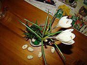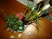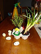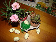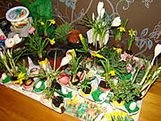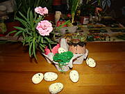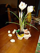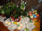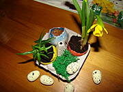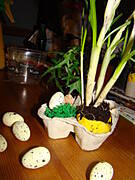 O kurczę, ale żeś tego nazbierała. Rzeczywiście dla cierpliwych :) Ja po prostu wyjęłam białe doniczki, które służyły do dekoracji bożonarodzeniowych, wpakowałam do nich doniczkę z szafirkami, upchałam w szczeliny mchu, do każdej doniczki władowałam a to małe jajko ceramiczne, a to drewnianego zajączka, a to puchatego kurczaczka. Na koniec obwiązałam materiałową zieloną lub żółtą lamówką i cześć :D