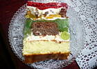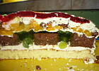 Ciasto jest rewelacyjne!!! Zrobiłam je na imieniny do pracy i wszyscy byli zachwyceni. Prezentowało się imponująco i tak samo smakowało. Wprowadziłam tylko jedną modyfikacje, ponieważ nie znalazłam zielonych winogron a fioletowe nie pasowały kolorystycznie, zmieniłam kolejność warstw i górną przełożyłam masą jabłkową według mojego przepisu. Koleżanki nie mogły się nadziwić jakie to pyszne i wykwintne ciacho. Niestety, wyszło wysokie i galaretka mi się nie zmieściła, dlatego na wierzchu ubrałam jak umiałam kandyzowanym ananasem i brzoskwiniami. Udało mi się zrobić zdjęcie przed pokrojeniem i drugie kiedy już niewiele zostało.