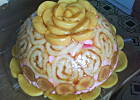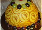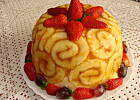 Zagotować 750ml wody, wsypać galaretkę, rozpuścić, schłodzić. Ubić kremówkę. Tężejącą galaretkę wlać do kremówki - mieszać robotem na niskich obrotach. Dodać przygotowane wcześniej owoce, wymieszać. Masę piankową z owocami wyłożyć do miski, przykryć pozostałymi plastrami rolady. Schłodzić w lodówce min. 3-4 godz. Wyłożyć na talerz. Posmarować glazurą. Dekorować według uznania.