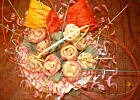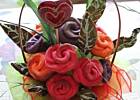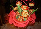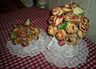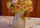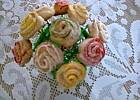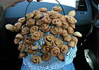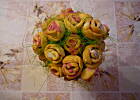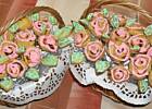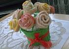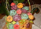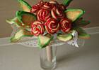 Jak już mam gotowy „trzon" bukietu, to kolejno wbijam ciasteczka różyczki i listki, formując zgrabny bukiet, na koniec ozdabiam to papierową serwetką.