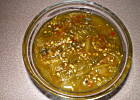 użyłam czerwonej papryki, dodałam cebule kilka ząbków czosnku i garść rodzynek. co prawda bez chili ale zastąpiłam ostrą papryką i zrezygnowałam z imbiru. smak wyszedł extra. robiłąm z potrójnej porcji i bardzo dobrze bo jeden słoiczek zjedliśmy tego samego dnia do obiadu