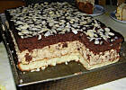Piekarnik rozgrzać do 160 stopni. Białka ubić mikserem ze szczyptą soli na sztywną pianę, po czym stopniowo dosypywać cukier. Gdy wsypiemy cały cukier znów stopniowo dodajemy po 1 żółtku. Na koniec partiami wsypywać po troszku mąki wymieszanej z proszkiem do pieczenia i wyłożyć na dużą (25*40) blachę, wyłożoną papierem do pieczenia. Piec ok.25 minut. Biszkopt ciemny robimy identycznie, na koniec dodajemy tylko kakao. Obydwa blaty biszkoptowe studzimy. Zagotować szklankę mleka i gorącym (ale nie wrzącym), zalać kawę rozpuszczalną i cappuccino. Dobrze wymieszać, ostudzić i wstawić do lodówki. Pozostałe mleko także schłodzić. Zimne płyny (łącznie 0,6 l ) zmiksować z sernikiem na zimno Delecty przez 3-4 minuty, zgodnie z instrukcją na opakowaniu. Na spód blachy wyłożyć jasne ciasto, rozsmarować pół sernika, powciskać groszek ptysiowy, z odstępem co 5 cm. Przykryć resztą masy serowej i przykryć ciastem ciemnym. Lekko docisnąć, aby warstwy skleiły się z sernikiem i wstawić do lodówki. Czekoladę pokruszyć i rozpuścić z masłem na małym ogniu. Gorącą wylać na ciasto i rozsmarować. Płatki migdałowe zrumienić na suchej patelni teflonowej i posypać ciasto. Schłodzić. Najlepiej przygotować dzień lub 2 dni wcześniej. Biszkopt będzie wilgotniejszy i ciasto smaczniejsze