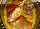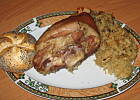 Tak przygotowaną kapustę wykładamy na blachę, następnie układamy golonka, nakładając na każde kawałeczek masła. Zapiekamy do przypieczenia się skóry (czas zależny od piekarnika i jego funkcji, ja piekłam pól godziny).