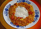 Przepis sprawdzony, wykonany z pewnymi modyfikacjami. Z przypraw dodałam jeszcze sól, pieprz ziołowy, paprykę w proszku, gałkę muszkatołową. Lubię bardziej wyraziste potrawy w smaku. Ograniczyłam się tylko do dolania 1/2 litra wody. Podałam z ryżem ugotowanym na sypko.