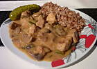 Mięso umyć osuszyć i pokroić w kostkę. Posolić i popieprzyć. W rondlu rozgrzać smalec. Obsmażyć na nim mięso na złoty kolor. Dodać sproszkowaną paprykę i obraną, pokrojoną w półplasterki cebulę. Smażyć do zeszklenia cebuli. Pieczarki umyć, obrać pokroić w plasterki i smażyć na maśle do momentu, aż płyn wyparuje a pieczarki się lekko zrumienią. Dodać je do mięsa wraz z pokrojonymi w cienkie plasterki ogórkami. Doprawić solą, pieprzem i cukrem. Podlać rosołem. Dusić na małym ogniu do miękkości mięsa. Dodać śmietanę wymieszaną z mąką i odrobiną wody. Zagotować.