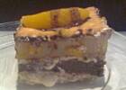 Na górze układamy kolejną warstwę herbatników. Posypujemy wszystko cukrem pudrem, a na każdym herbatniku układamy po jednym plasterku brzoskwini. Czekoladę rozpuszczamy w kąpieli wodnej i polewamy nią brzoskwinie. Wkładamy do lodówki na 3- 4 godziny.