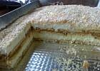 Na patelnie nasypać resztę (50 g ) wiórek kokosowych i 1,5 łyżeczki cukru. Ustawić patelnię na małym ogniu i ciągle mieszając, doprowadzić wiórki do zarumienienia. Odstawić do wystudzenia a następnie takimi już wystudzonymi posypać wierzch ciasta.