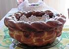 Następnie formujemy brzeg koszyka. Na pergaminie obrysowujemy miskę. Toczymy z ciasta trzy długie wałki i zaplatamy warkocz. Warkocz układamy na obrysowanym kole. Ciasto smarujemy żółtkiem i pieczemy do uzyskania ładnego złotego koloru.
